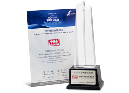 2010年,明緯榮獲經(jīng)濟部國際貿(mào)易發(fā)展局頒發(fā)「2010臺灣優(yōu)良品牌獎」,創(chuàng)辦人林國棟先生代表明緯集團領獎,此獎肯定明緯長期深耕自有品牌的努力與成果。