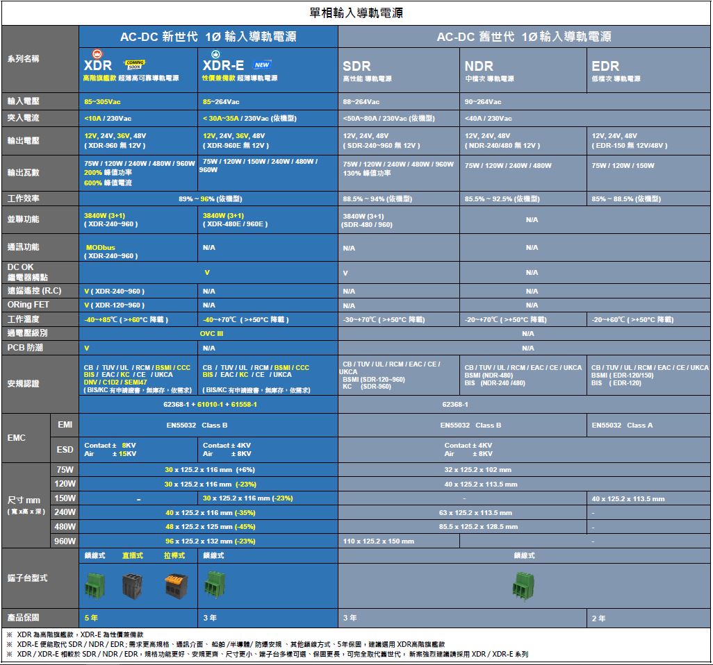 XDR-E 系列:75W~960W 全新世代 1? 輸入超薄性?xún)r(jià)兼?zhèn)鋵?dǎo)軌電源