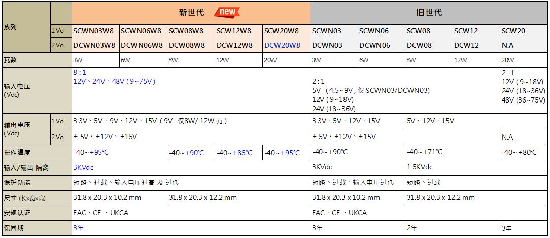 明緯DC-DC模塊型單組輸出SCWN03/ SCWN06 / SCW08 / SCW12 / SCW20及雙組輸出DCWN03 / DCWN06 / DCW08 / DCW12 DIP 雙排標(biāo)準(zhǔn)引腳封裝3~20W 2:1 輸入機(jī)型上市多年,年銷數(shù)十萬臺(tái),廣泛應(yīng)用于電力、電子儀表、通信設(shè)備、工業(yè)自動(dòng)化控制、IoT…等, 新上市次世代8:1輸入超寬壓輸入單組輸出 SCWN03W8/ SCWN06W8 / SCW08W8 / SCW12W8 / SCW20W8及雙組輸出 DCWN03W8 / DCWN06W8 / DCW08W8 / DCW12W8/ DCW20W8共5系列。