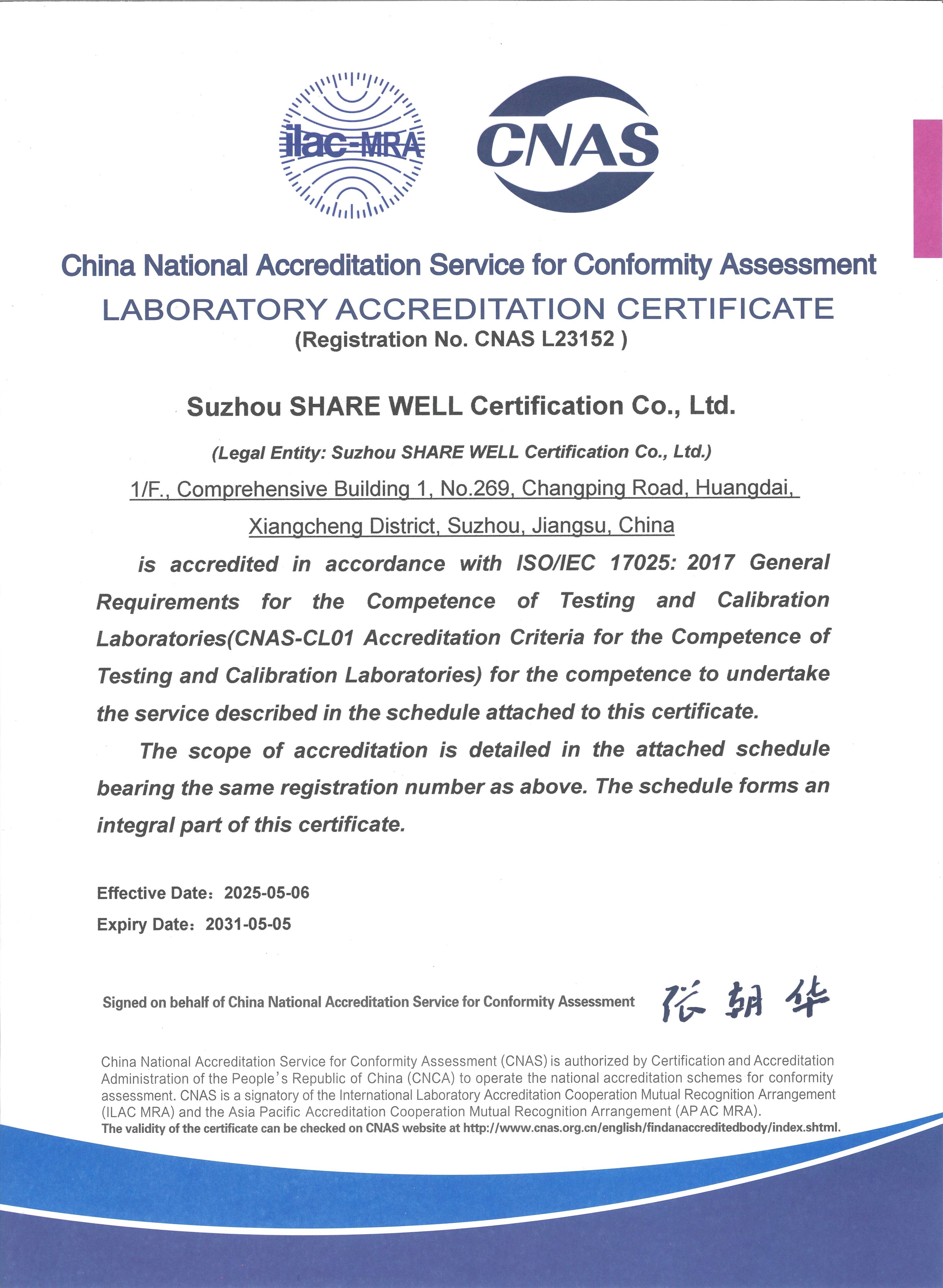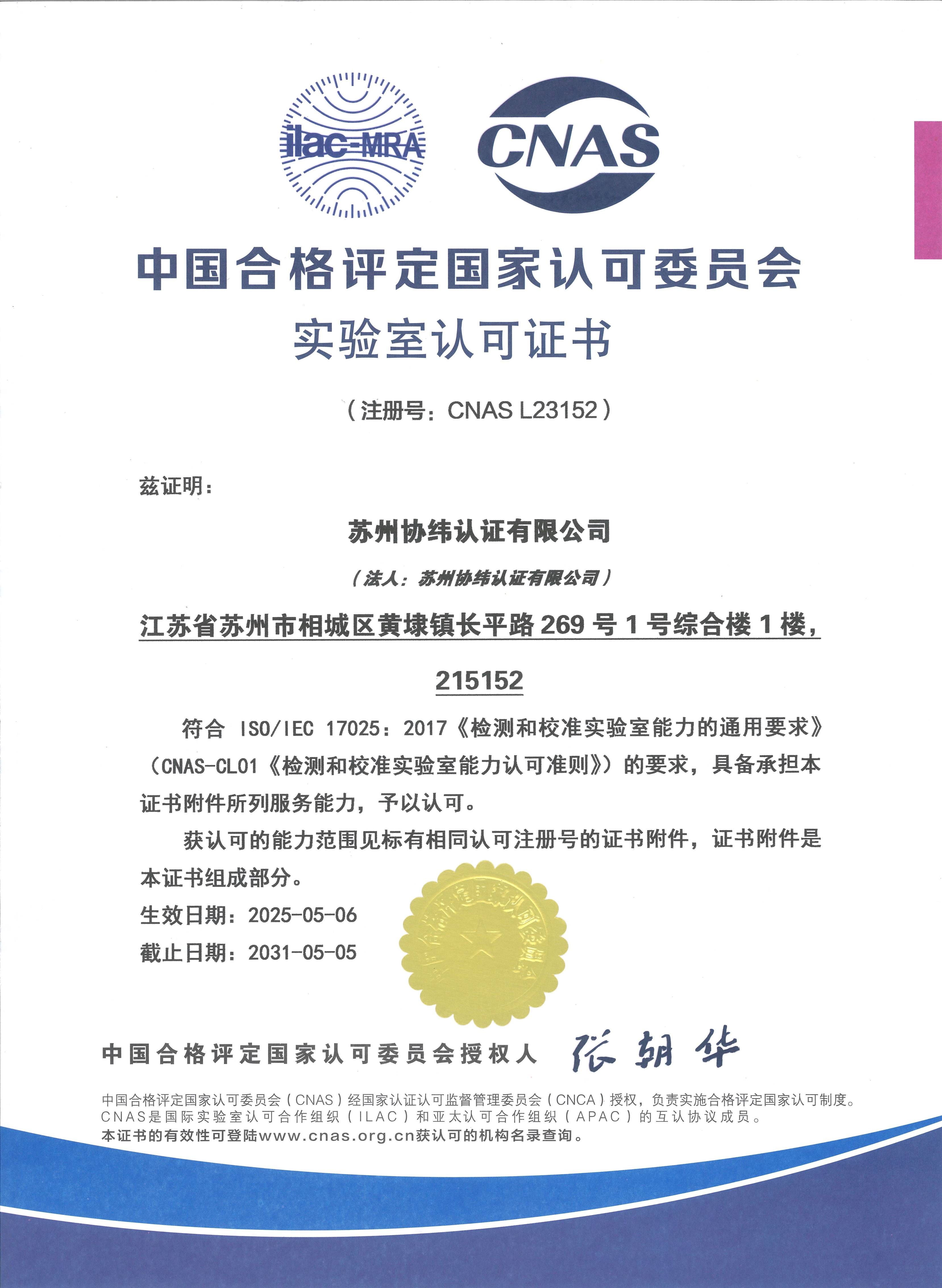 2025年5月6日蘇州協(xié)緯認證有限公司正式獲得中國合格評定國家認可委員會(CNAS)頒發(fā)的實驗室認可證書(注冊號:CNAS L23152)。這標志著該實驗室在電磁兼容檢測領(lǐng)域的技術(shù)能力和質(zhì)量管理體系已達到國際水平。