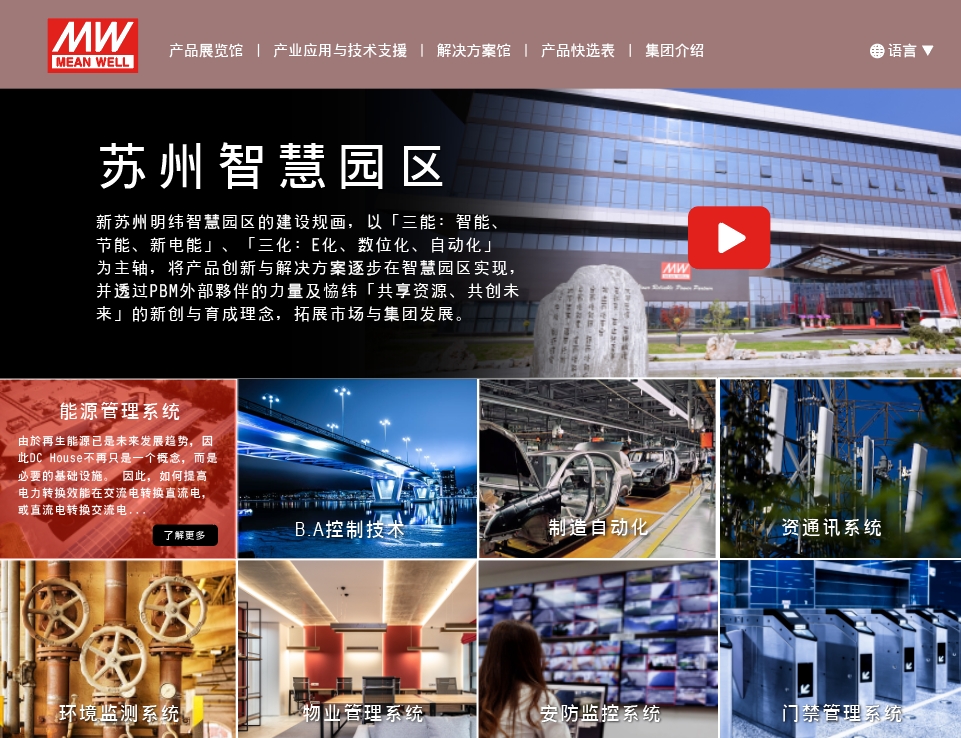 甫于2022/11/10全新開幕啟用的蘇州明緯智能園區(qū),以明緯集團(tuán)推廣「三能:智能、節(jié)能、新電能」、「三化:E化、數(shù)字化、自動(dòng)化」為主軸,實(shí)現(xiàn)產(chǎn)品創(chuàng)新與解決方案的應(yīng)用園區(qū)。誠(chéng)摯的邀請(qǐng)您參觀園區(qū)內(nèi)的八大系統(tǒng)科技應(yīng)用,您將了解標(biāo)準(zhǔn)電源于各產(chǎn)業(yè)應(yīng)用息息相關(guān)的明緯,所提供各式豐富的解決方案。