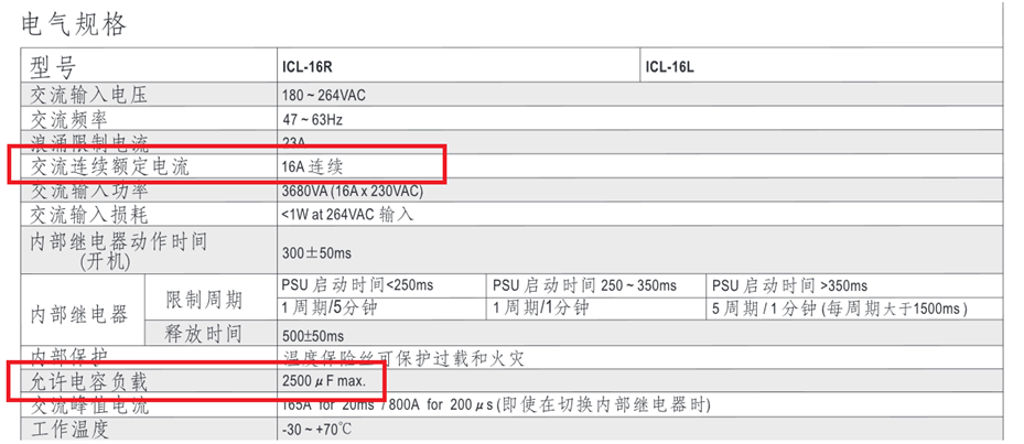 根據(jù)以下ICL-16R規(guī)格書得知其交流連續(xù)額定電流為16A,最大允許電容負(fù)載為2500μF。