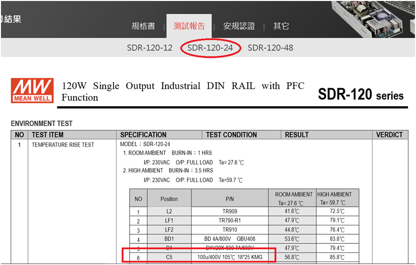 根據(jù)以下明緯官網(wǎng)SDR-120-24測(cè)試報(bào)告中環(huán)測(cè)測(cè)試數(shù)據(jù)得知輸入大電容容值為100μF。