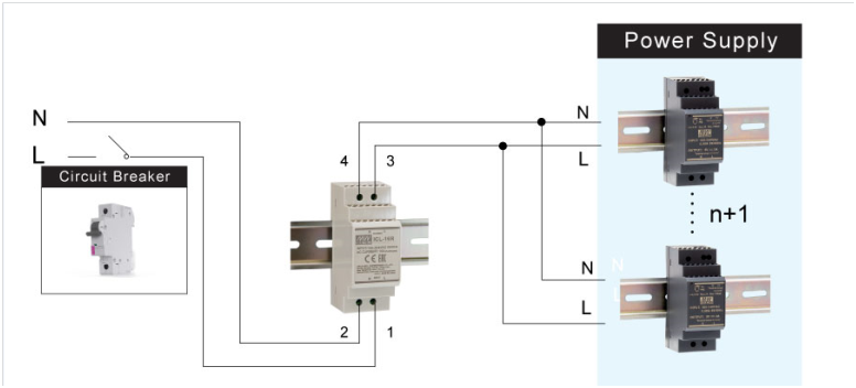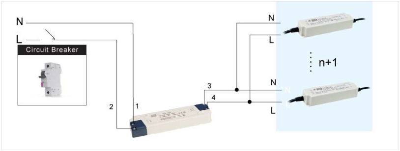 并接多臺(tái)明緯電源供應(yīng)器時(shí),應(yīng)慎選合適的斷路器,以避免一開機(jī)斷路器即跳脫保護(hù);若實(shí)在并接太多臺(tái)而無(wú)法挑選合適的單一斷路器,此時(shí)應(yīng)考慮使用多個(gè)斷路器分路保護(hù)。