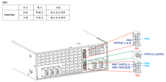 其輸出電壓電流的數(shù)值可藉由PV/PC功能來設(shè)定。此系列的PV/PC功能只能擇一使用,其選擇方式是藉由CN1的 PIN5/PIN6 開路或短路來決定;若是短路,則是選擇PV模式,可以調(diào)整輸出電壓;若是開路,則是選擇PC模式,可以調(diào)整輸出電流。