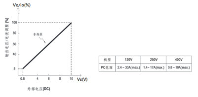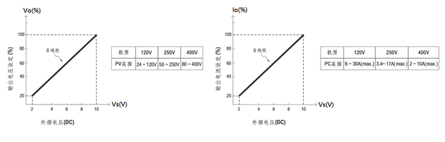 在PV模式下,有三種可以調(diào)整Vo的方式,第一種方式是藉由SVR2調(diào)整,其調(diào)整范圍為額定電壓的20~100%。第二種方式是在CN2的PIN7/PIN8之間外加一直流電壓訊號Vs,其調(diào)整范圍為額定電壓的20~100%,請參考圖六所示;若Vs<2V,則Vo≧額定電壓的10%。第三種方式是在CN2的PIN5/PIN6之間外加一直流電壓訊號Vs,其調(diào)整范圍為額定電壓的8~100%,請參考圖八所示,范圍較寬,且響應(yīng)速度較快。
