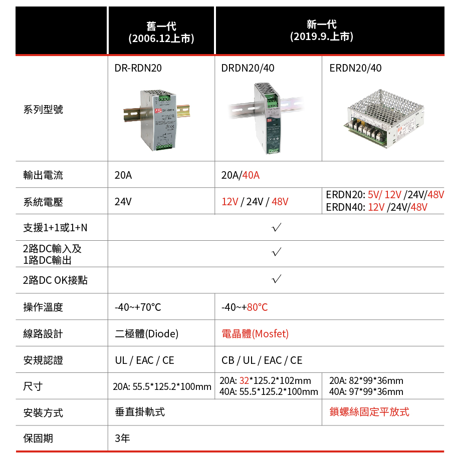 因?yàn)槿哂喈a(chǎn)品需求越來(lái)越多,舊款冗余模塊的體積與效能無(wú)法滿足需求,明緯新開(kāi)發(fā)了次世代軌道型可快速掛軌的DRDN20/40系列,并同時(shí)規(guī)劃了采鎖螺絲固定的機(jī)殼型ERDN20/40系列,新舊世代詳細(xì)差異如圖三所示。
