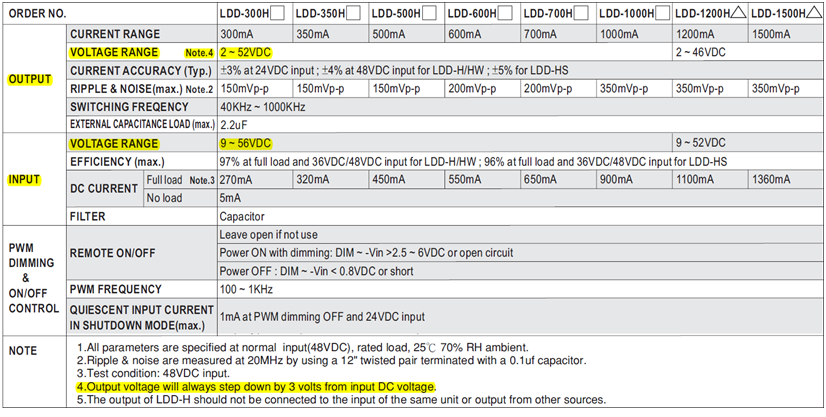 以LDD-350H的規(guī)格來解釋說明,LDD-350H的輸出電流為350mA,輸出與輸入電壓范圍分別是: 輸入9~56VDC,輸出2~52VDC。實(shí)際輸出電壓由LED負(fù)載決定,而輸入電壓只要是比輸出電壓高3V都是可操作范圍。意思是當(dāng)LED順向偏壓是9V,則LDD-350H輸入在12~56VDC范圍都會正常工作。