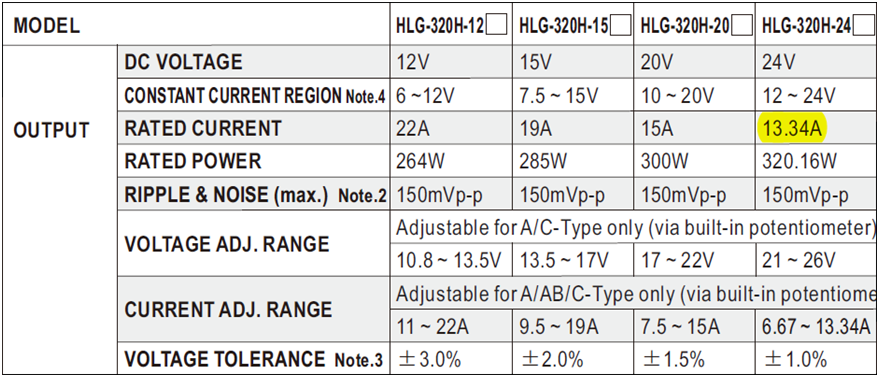 增加電流可藉由直接增加瓦數(shù),比如說HLG-320H-24換成HLG-480H-24,或是換成低壓(高電流)同功率產(chǎn)品,比如說 HLG-320H-24 (13.34A)換HLG-320H-12 (22A),必須注意選用的電壓必須是在電壓-電流轉(zhuǎn)換器的輸入范圍內(nèi)。