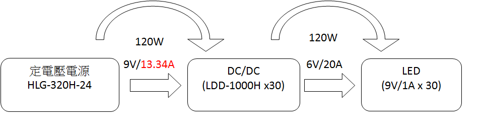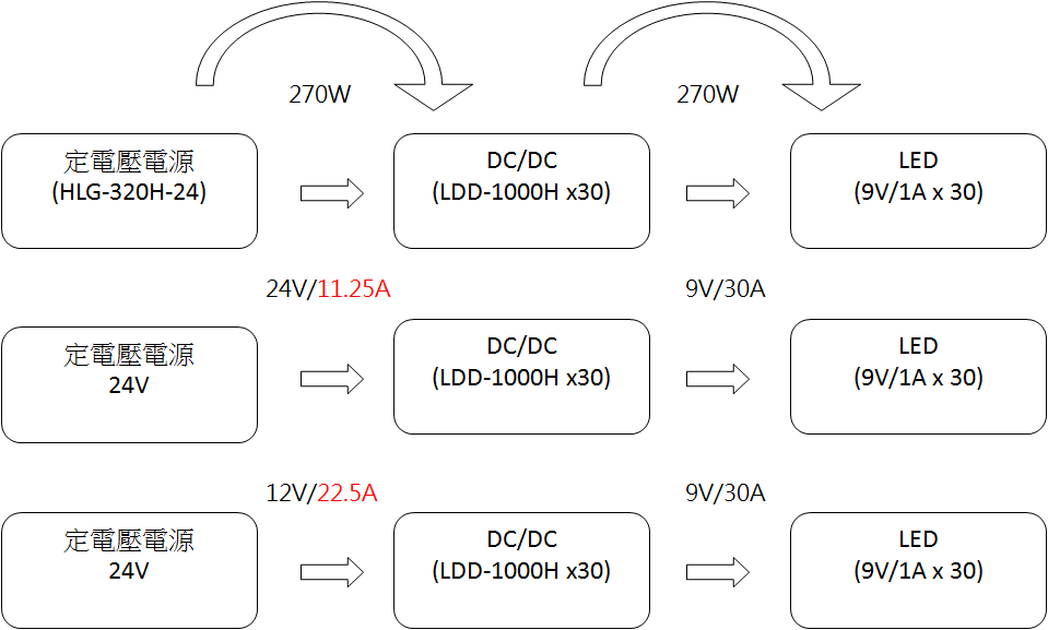 主因?yàn)殡娏鬓D(zhuǎn)換器啟動電壓低于前端電源供應(yīng)器的額定電壓,當(dāng)在低壓啟動工作下,電流轉(zhuǎn)換器需求電流高于電源可輸出電流值。以圖三為例,輸出端燈條每條上的LED電壓電流是9V/1A,30條并聯(lián)時總輸出就是270W。如果燈具或轉(zhuǎn)換器輸入電壓標(biāo)示為 24V 輸入,一般人可能會選 24V、大于300W的LED驅(qū)動器,比如說HLG-320H-24。