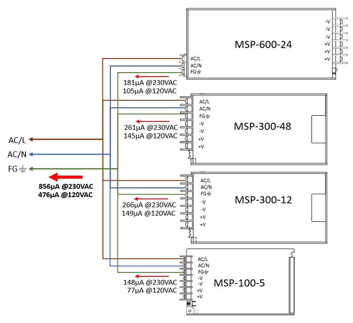 圖1顯示了明緯單臺模塊電源產(chǎn)品 NMP1K2-HHEKC#-01的漏電流測試結(jié)果,該機(jī)型由24V,12V,48V和5V四個(gè)輸出模塊組成。圖2顯示了使用四臺單輸出電源時(shí)的總漏電流,四臺機(jī)型分別為MSP-600-24、MSP-300-12、MSP-300-48與MSP-100-5。