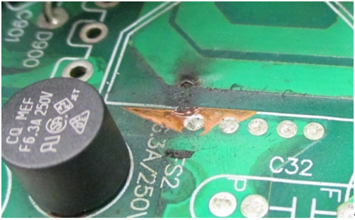 圖三、因積塵/濕氣問題導(dǎo)致銅箔跳火