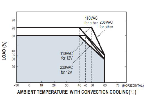 自然對流冷卻是消散電源運轉(zhuǎn)過程中產(chǎn)生之熱能的最便捷方式,由于沒有使用風(fēng)扇,因此不會發(fā)出吵人的噪音,同時電源內(nèi)部也不會有灰塵被吹入。根據(jù)圖四的降載曲線,該解決方案適用于額定功率低于60-70%的負載,為了使氣流在設(shè)備中確實流通,應(yīng)注意其上方的間隙距離要有10cm,對于更高的功率需求,強制風(fēng)冷和傳導(dǎo)冷卻則較為合適。