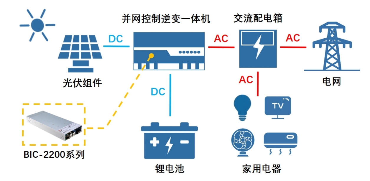 家用儲(chǔ)能系統(tǒng)(如圖2..),主要包括光伏組件、鋰電池、并網(wǎng)控制逆變一體機(jī)和家用電器等。在夜間把電力系統(tǒng)的低價(jià)電力,通過一體機(jī)內(nèi)部的BIC-2200對鋰電池充電儲(chǔ)能;在白天電網(wǎng)高負(fù)荷的時(shí)候,鋰電池再經(jīng)BIC-2200反向輸出能量并回饋至電力系統(tǒng),不僅可以削峰填谷,減輕電網(wǎng)波動(dòng),還能為家庭節(jié)省電力開支。