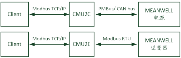 明緯智能控制器:CMU2C、CMU2E等皆導(dǎo)入Modbus TCP/IP作為對(duì)外鏈接的通訊手段。換個(gè)方式而言,客戶不需要花時(shí)間了解如何控制電源,而只需要專心整合系統(tǒng)即可,電源之間相關(guān)的通訊則留給電源的專家:明緯,幫忙處理即可。有關(guān)各控制器的詳細(xì)使用說(shuō)明,請(qǐng)參考其使用手冊(cè)。
